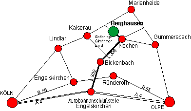 Ausfahrt Engelskirchen, dann links Richtung Marienheide bzw. Nochen (L302 + L 306) gerade aus bis zum Ende der Ausbaustrecke in Nochen,